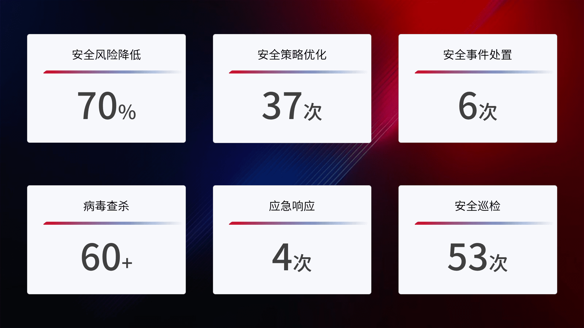 提供全面的安全事件报告体系,,,,包括处置报告、、、周报、、、季度和年度总结,,,,结合持续监控,,,帮助客户深入了解网络安全状况。。