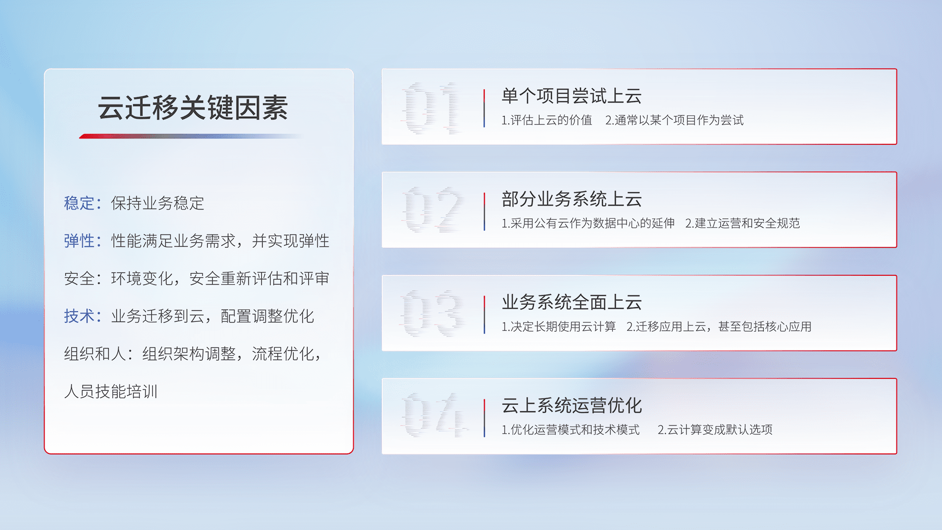 结合实际业务,,,,从规划设计、、、、云平台选型、、、、云原生改造、、、、数据迁移、、、、集成交付,,迁移全过程为客户识别最佳上云路径,,,做好风险识别管理,,设计网络架构、、、身份权限、、安全审计合规、、、操作审计、、日志审计、、、监控告警策略、、、、多站点容灾设计等,,,对云上基础设施进行整体规划,,,提升IT治理水平,,,以满足弹性、、、高可用、、、高性能的需求。。。