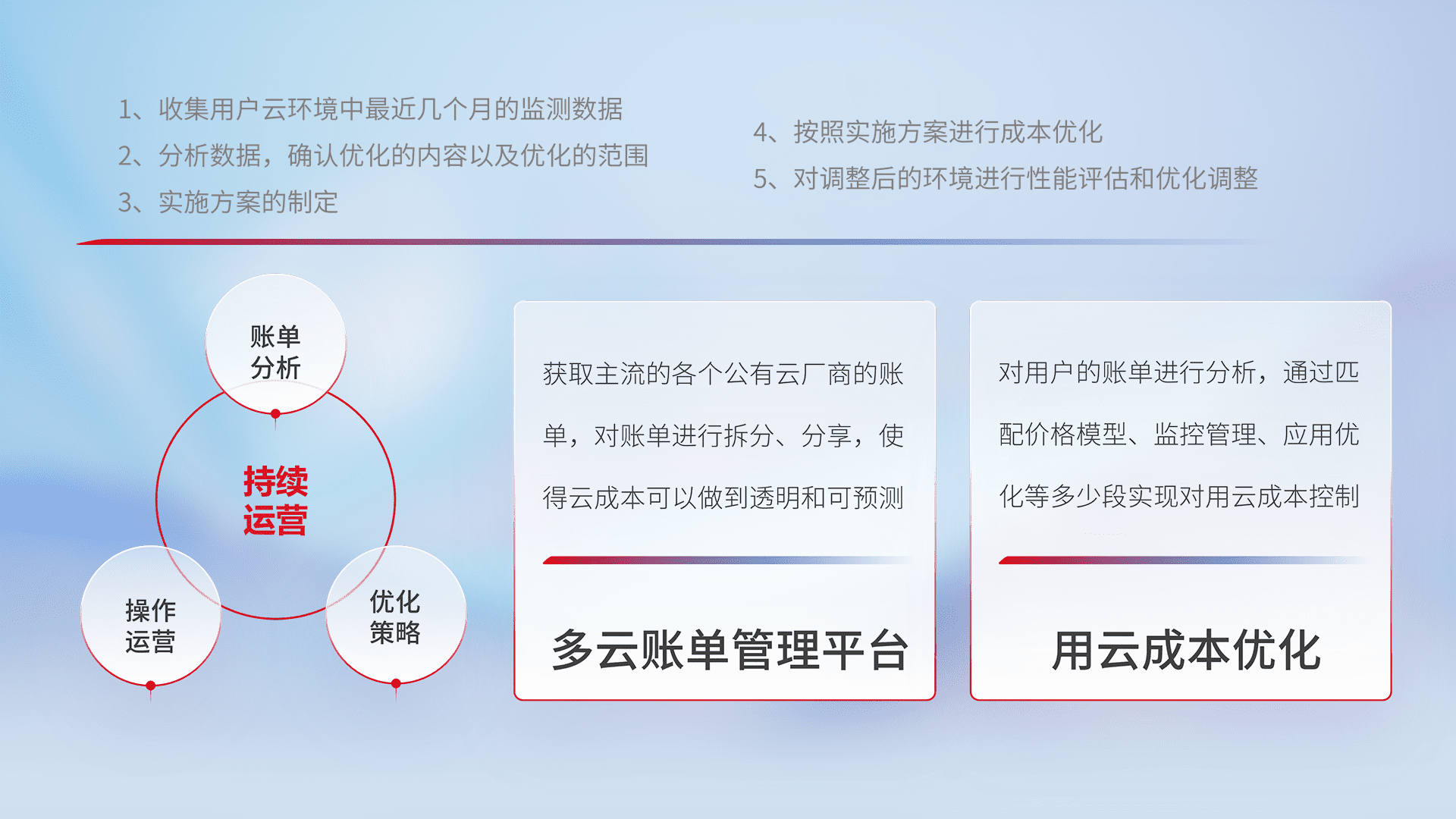 通过多云纳管,,,,以统一的资源数据模型把客户的云资源进行抽象和封装,,,进而实现对多云资源的统一操作,,,保障云资源管理的可靠性、、稳定性与可用性。。。量身定制化运维内容,,配置、、开发运维、、、补丁管理、、备份、、、监控、、、、认证和访问管理、、、、审计和日常巡检等,,,,保障在用云过程中的可靠度,,,稳定度以及高可用率。。。